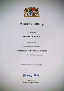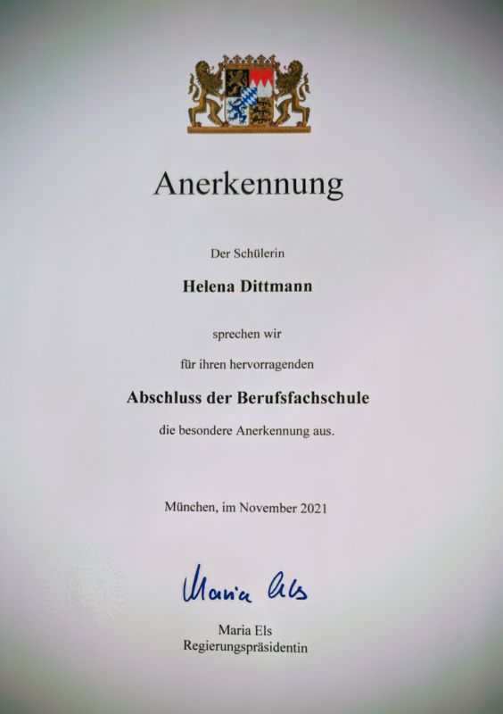 2018 war es dann endlich so weit: Ich erhielt meinen lang ersehnten Ausbildungsplatz und konnte meinen Herzenswunsch verwirklichen. Meine Ausbildung absolvierte ich von 2018 bis 2021 – die ersten zwei Jahre in Ingolstadt, für das dritte Jahr konnte ich nach München wechseln. In den „heiligen Hallen“ der Maistraße habe ich schließlich mein Examen erfolgreich abgelegt und durfte für mein sehr gutes Abschlusszeugnis sogar einen Staatspreis entgegennehmen.